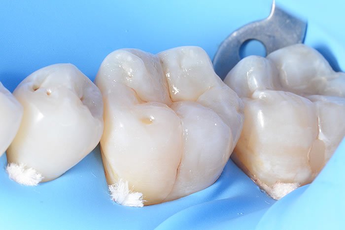 Step 9Occlusal layer is completed with Bio Function BF1 from cusp to cusp, followed by application of BROWN stain.