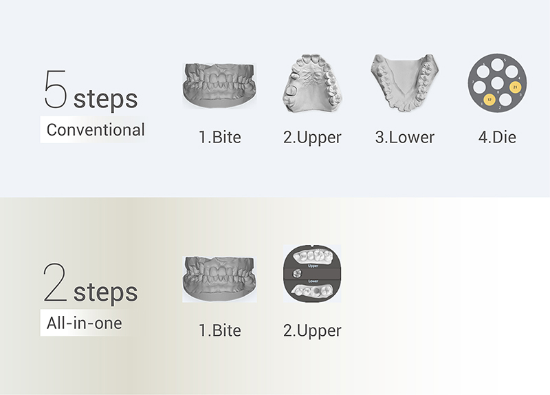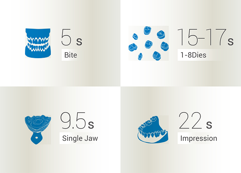 With increased scan speed, a single jaw scan can be finished in 12 seconds. The entire process of a separate-die order can be completed within 2 minutes and a non-separated-die order within 2.5 minutes.