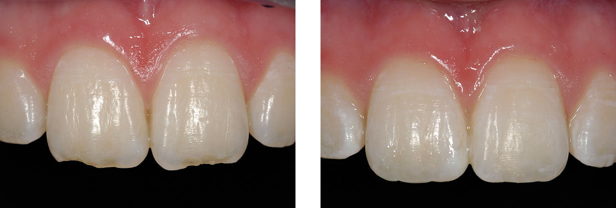 Étape 7L’émail vestibulaire est réalisé avec la même teinte HRi UE2 utilisée aussi pour remplir l’espace entre les mamelons afin de créer l’opalescence. |