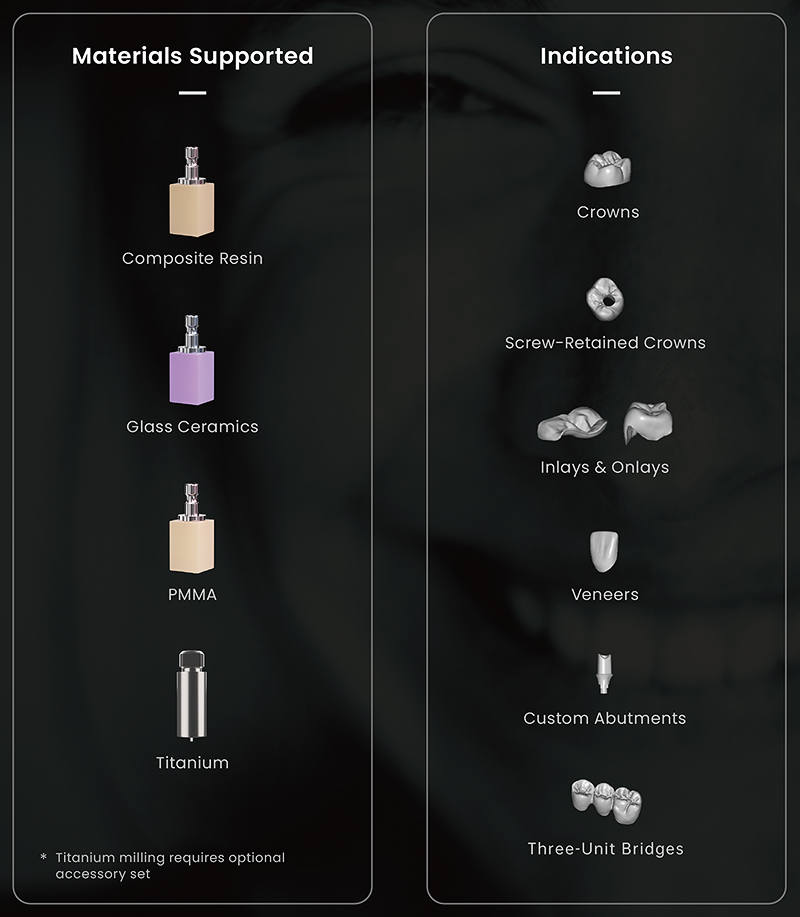 Elle est optimisée pour le fraisage de haute qualité des vitrocéramiques, du PMMA et des résines composites — idéale pour les couronnes, «copings», «inlays», «onlays» et bien plus encore.