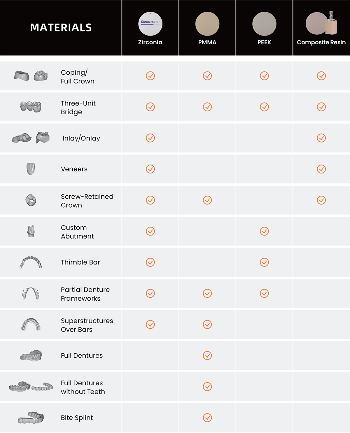 «Coping», couronne complète, pont de couronnes complètes, couronne vissée, «inlay», «onlay», facette, tenon et moignon, infrastructure de prothèse partielle amovible, pont implantaire, prothèse complète, gouttière occlusale, superstructure sur barre, aligneur esthétique, modèle |